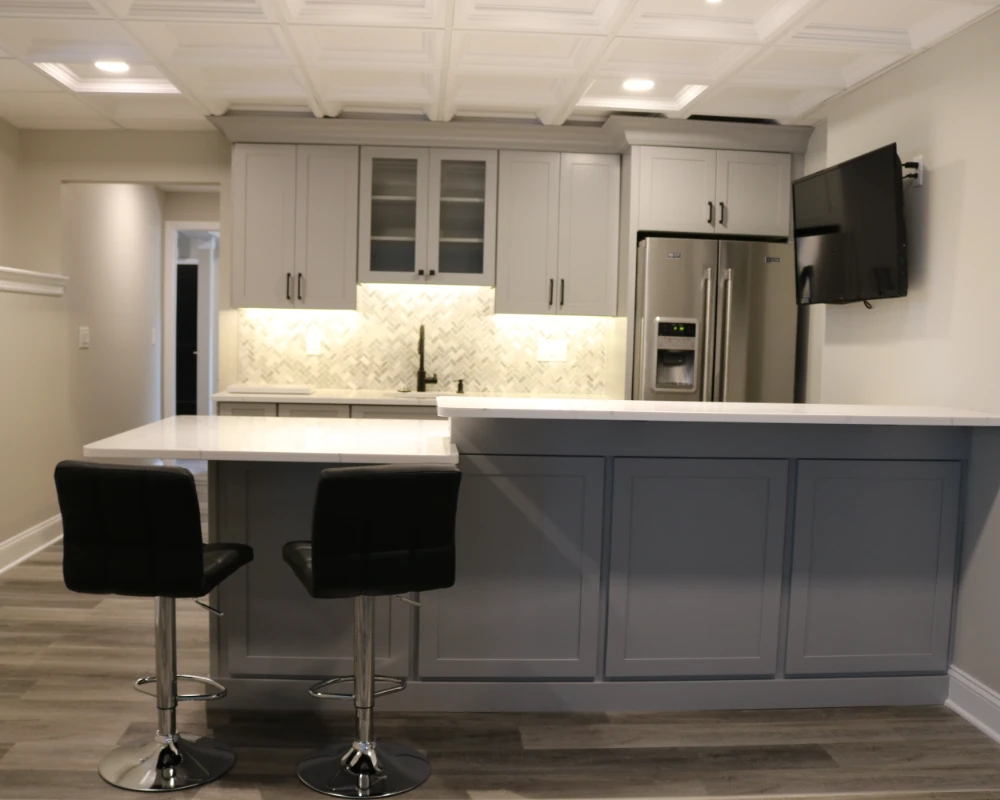 At Armstrong Interiors, we pride ourselves on transforming unfinished basements into beautiful, functional spaces that add value and enjoyment to your home. For this basement finishing project in Flemington, New Jersey, we took an exposed, raw space and turned it into a luxurious and versatile area that serves as both a kitchen and bar hub and a comfortable gathering spot.